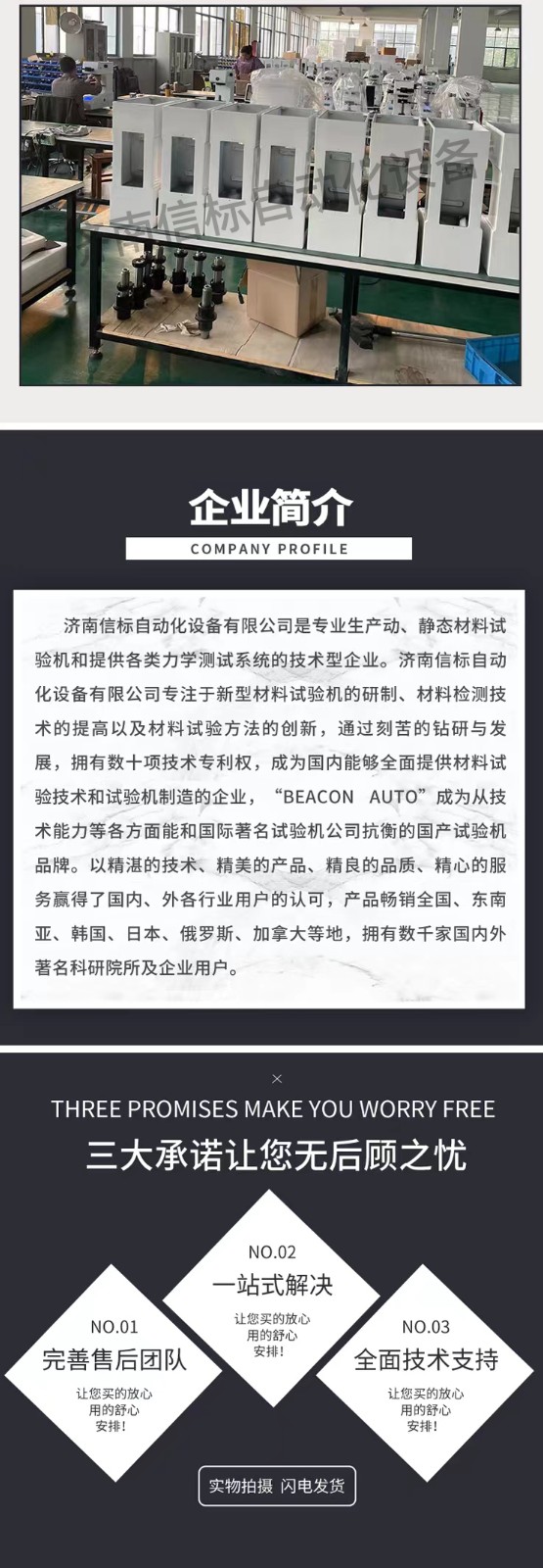 濟南信標自動化設備有限公司主要生產:動靜態萬能疲勞試驗機,接骨板彎曲試驗機,縫合線拉伸疲勞試驗機,髖膝關節磨損試驗機,電子萬能試驗機、液壓萬能試驗機、巖石三軸、四軸,電液拉力試驗機,材料試驗機,高低溫蠕變,高低頻疲勞,拉伸、扭轉、杯突等二十多個系列兩千多個的品種。