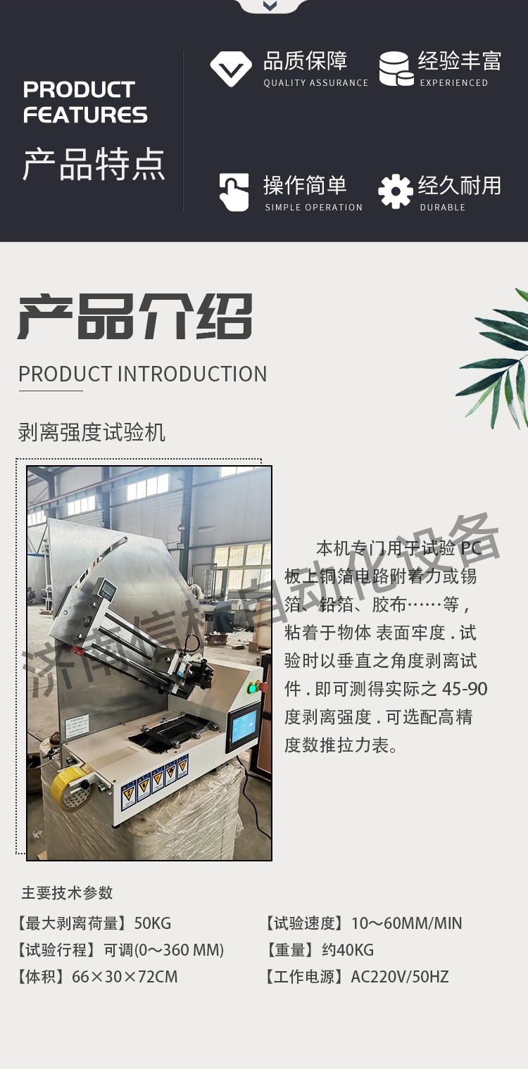 試用范圍:本機專門用于試驗PC板上銅箔電路附著力或錫箔、鉛箔、膠布……等,粘著于物體 表面牢度.試驗時以垂直之角度剝離試件.即可測得實際之45-90度剝離強度.可選配高精度數推拉力表。